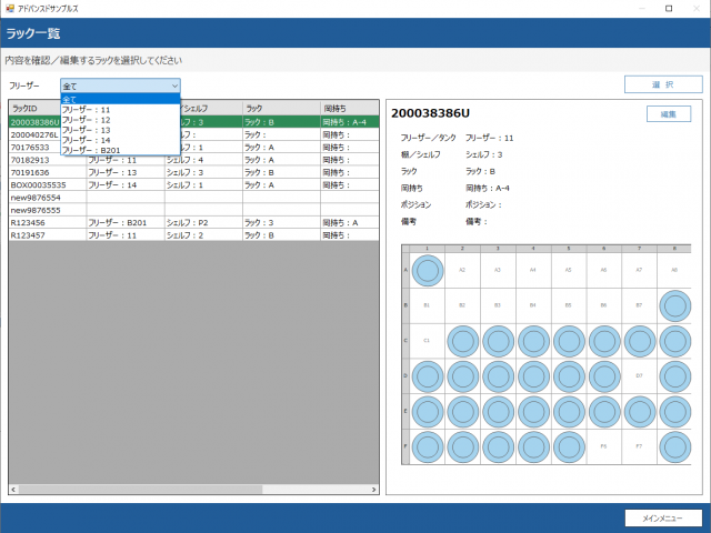ロケーション項目は固定、フリーザーごとの保存ラックのリスト表示もできます。