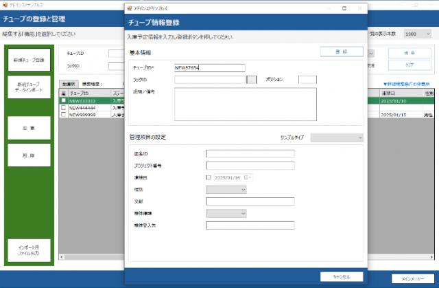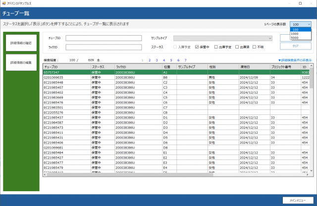 在庫管理:ラック管理、チューブ管理、一覧表示