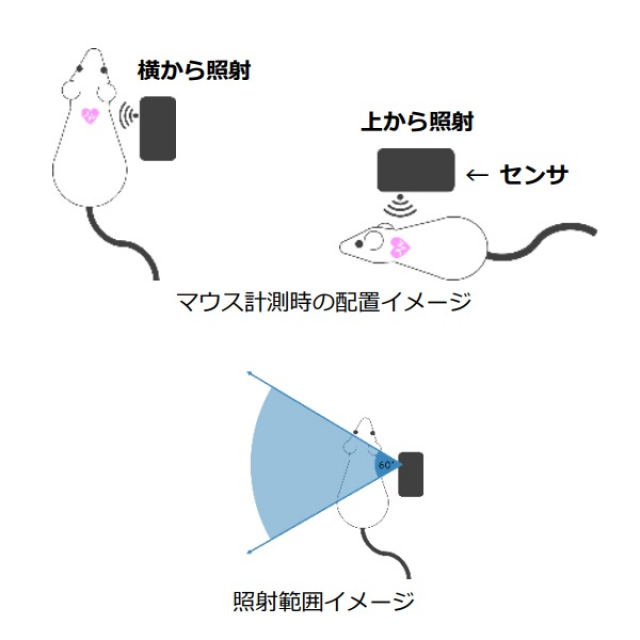 ■ レーダーセンサを利用した非接触式測定法のため、センサから対象動物の胸部に向けて照射するだけで体位を問わず測定できます。